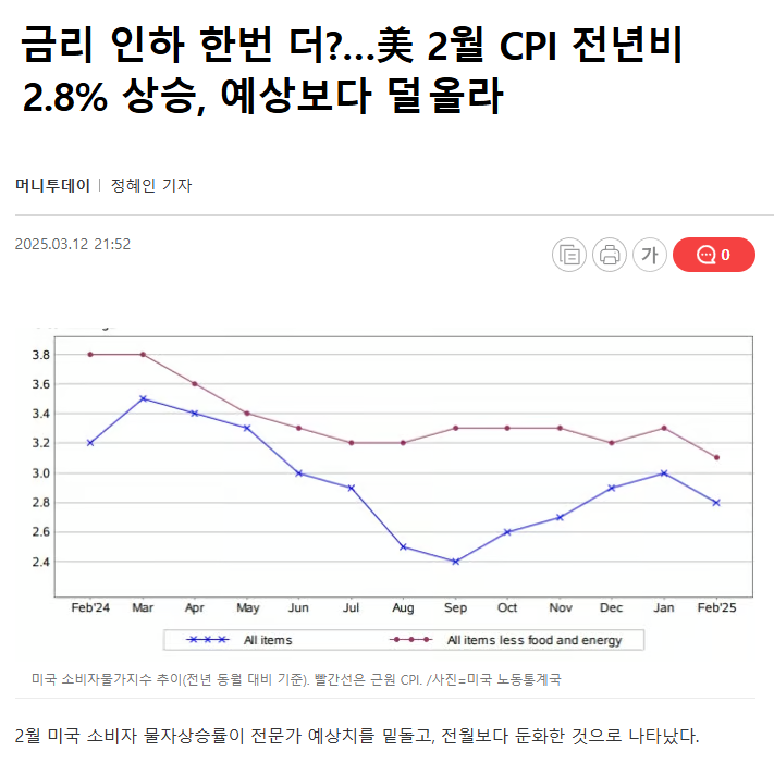 2월 미국 소비자 물가지수 CPI가 발표 되었습니다.