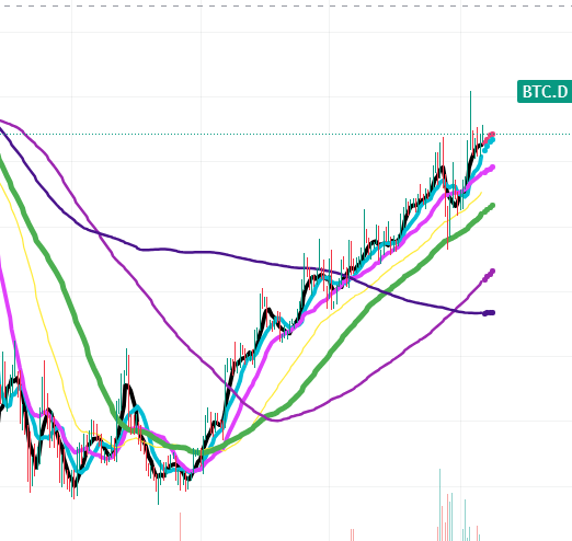 또한 현재 비트코인 도미넌스를 보면 상승세가 꺾이지 않은 것을 확인할 수 있습니다.(주봉 기준)
